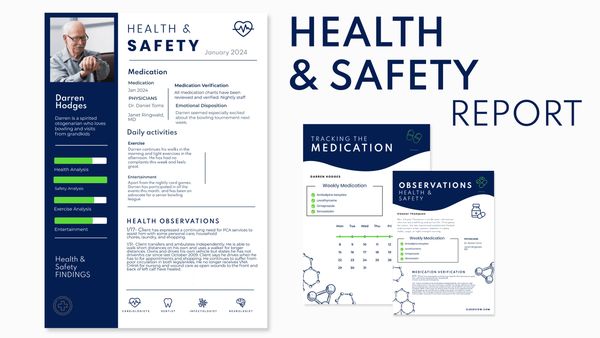 Real time health and safety reports delivered monthly. Be confident your loved one's medication is administered properly. Ask about our Medication Verification Service.